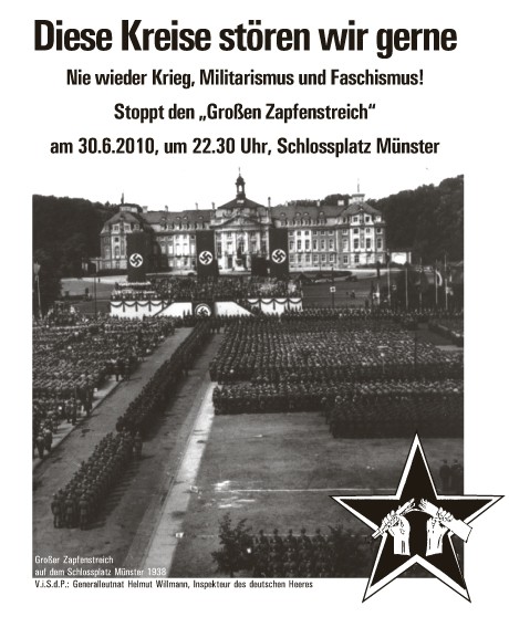 Zwischen 1933 und 1945 hielt die Wehrmacht „Große Zapfenstreiche“ auf dem Münsteraner Schlossplatz ab. Heute ist die Geschichtsvergessenheit und Remilitarisierung der deutschen Gesellschaft so weit voran geschritten, dass es kein Tabu mehr ist, militaristische Veranstaltungen in kaum verändertem Stil genau dort abzuhalten, wo es einst das Nazimilitär tat.