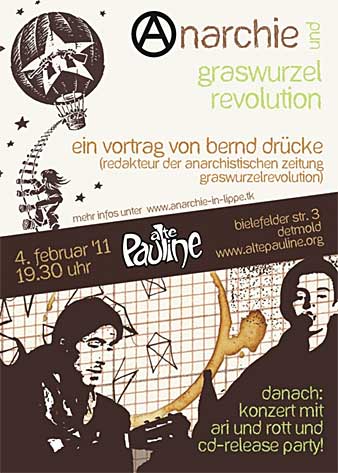 Dr. Bernd Drücke (Koordinationsredakteur der graswurzelrevolution) wird die libertäre Gesellschaftsform am Freitag den 04. Februar 2011 im Kulturzentrum "alte Pauline" in Detmold, im Rahmen des "Bambule Cafe’s", um 19.30 Uhr vorstellen und im Anschluss gibt es die Möglichkeit zur Diskussion.