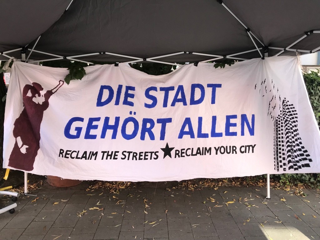 Transpi der Zentrale-Besetzer*innen (Initiative Münster Bahnstadt Süd) beim Breul-Tibus-Straßenfest, 24.8.2019. Foto: Bernd Drücke