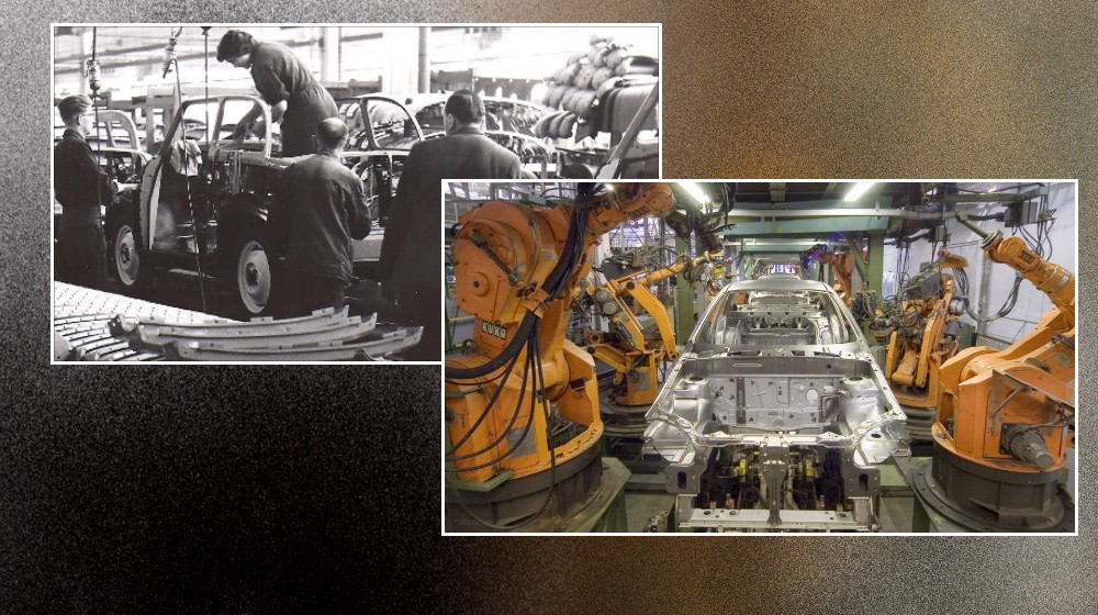 Automobilproduktion in den 1950ern und 1983. - Fotos: Mixabest / CC BY-SA (https://creativecommons.org/licenses/by-sa/3.0), JOHN LLOYD from Concrete, Washington, United States / CC BY (https://creativecommons.org/licenses/by/2.0)