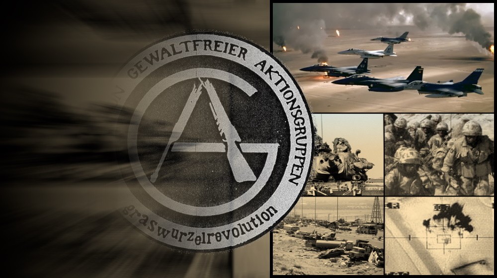 Bereits im November und Dezember 1990 blockierten gewaltfreie Aktionsgruppen und weitere Antikriegsgruppen die US-Truppenverlegung von der BRD in die Golfregion. Die Blockaden liefen unter dem Slogan: „Ami stay here!“ anstatt dem üblichen antiamerikanischen Slogan: „Ami go home!“ Am 15. Januar 1991 kam es nach Mobilisierung durch die FöGA (Föderation gewaltfreier Aktionsgruppen), kriegsgegnerische Autonome und Reste der Frankfurter Startbahnbewegung zu einer Massendemo mit Blockade der Frankfurter Air Base, über die der Nachschub von Soldaten und Material erfolgte. Diese Antikriegsdemonstration war der Auftakt zu einer Art Renaissance der 1980er-Friedensbewegung, nun jedoch gegen einen realen modernen Krieg. Thematisiert wurde dabei von gewaltfrei-libertären Organisator*innen und Redner*innen (u.a. Christian Sterzing vom eingeladenen Deutsch-Israelischen Arbeitskreis, DIAK, der ebenfalls den Krieg noch verhindern wollte) explizit die Bedrohung Israels durch Giftgaswaffen, die während kriegerischer Handlungen am akutesten sei. (4)