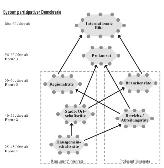 In einer künftigen Gesellschaft ist jede*r Erwachsene über Verbraucher- und Produzent*innen-Räte an gesellschaftlichen und politischen Entscheidungen beteiligt. Da aufgrund der reduzierten Arbeitszeit keine Arbeitslosigkeit besteht, ist jede*r von ihnen auf der einen Seite erwerbstätig, also Produzent*in, auf der anderen Seite Konsument*in. Nur für Menschen mit einer geistigen Behinderung besteht eine Repräsentation (s. u.). Auf der Seite der Verbraucher*innen sind die Vertretungsorgane der Rat der Hausgemeinschaft, in größeren Städten der Rat des Stadtteils und in kleinen und mittleren Gemeinden der Rat der Ortschaft, der Stadt und der Region. Auf der Pro-duzent*innenseite sind dies der Abteilungs- / Kleinbetriebsrat, der Betriebs- und der Branchenrat. Der Betriebsrat hat natürlich eine andere Bedeutung als heute, nämlich eine „exekutive“ Funktion. Über das „was“ produziert wird, entscheidet der Betriebsrat in Abstimmung mit dem wissenschaftlichen Beirat (s. u.), das „wie“ regeln die Kolleg*innen unter sich. Im höchsten Rat, dem Prokonrat (Produzent*innen/Konsument*innen-Rat) sind schließlich die Mitglieder aus dem Konsum- wie Produktionsbereich gemeinsam vertreten.