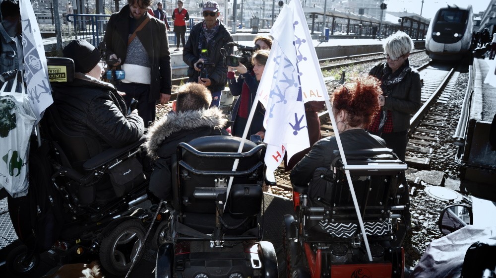 Die Aktivist*innen prangerten die mangelnde Barrierefreiheit im öffentlichen Personenverkehr mit einer einstündigen Blockade der Bahngleise am Bahnhof Toulouse-Matabiau an. Das Kollektiv hinderte einen Hochgeschwindigkeitszug, den TGV Toulouse-Paris, an der Abfahrt. Auf den besetzten Gleise wurde eine Pressekonferenz abgehalten. „Es ging darum, auf die nicht eingehaltenen Zusagen der französischen Eisenbahngesellschaft SNCF hinzuweisen, die Barrierefreiheit des Bahnhofs zu verbessern. Verpflichtungen, die acht Jahre alt waren und nicht umgesetzt worden sind“, erklärt Odile Maurin. Der Protest zeigte mehr Wirkung als jahrelange Gespräche. Die SNCF versprach nach der Aktion, Bauarbeiten durchzuführen. Dieses Versprechen wurde inzwischen zur Hälfte umgesetzt.
