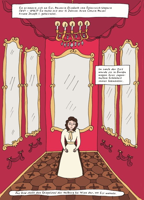 Am ehesten „Im Spiegelsaal“ – der entspricht am meisten dem, wie ich gerade jetzt denke. Ich bin sehr stolz auf alle meine Comics, aber viele der Comics, die ich gemacht habe, als ich jünger war, könnte ich heute niemals machen. Weil man kann sie nur in einer bestimmten Zeit im Leben machen, wenn man sich auf eine bestimmte Weise fühlt. Ich bin sehr dankbar, dass ich sie gemacht habe. Es ist immer besser, etwas zu tun, als etwas nicht zu tun!