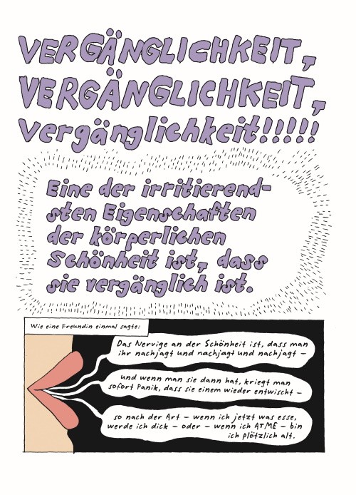 Was du in deiner Frage geschrieben hast – das fand ich superinteressant, weil Leute fragen mich oft: „Was ist der Sinn von deinen Comics, was willst du, soll passieren, wenn man sie gelesen hat?“ Das fällt mir oft schwer zu beantworten, aber es ist schön, wie du schreibst, dass es eine Widerstandsstrategie sein kann, einfach zu versuchen, es von Außen zu betrachten und zu analysieren, zu schauen, was die Mechanismen sind. Gerade jetzt leben wir in einer extrem krassen kapitalistischen Konsumgesellschaft, die uns den ganzen Tag mit ganz vielen Bildern bombardiert und uns zu verschiedenen Sachen zwingt und versucht, uns zu beeinflussen, uns unterzuordnen und auf verschiedene Weise unfair zu uns selbst zu sein – aber hilft es dir zu wissen, dass es so ist, oder bist du dann nicht immer noch genauso unglücklich? Man könnte hoffen, dass das Wissen darüber ein bisschen hilft, dass man zumindest ein kleines bisschen daraus herauszoomen kann.