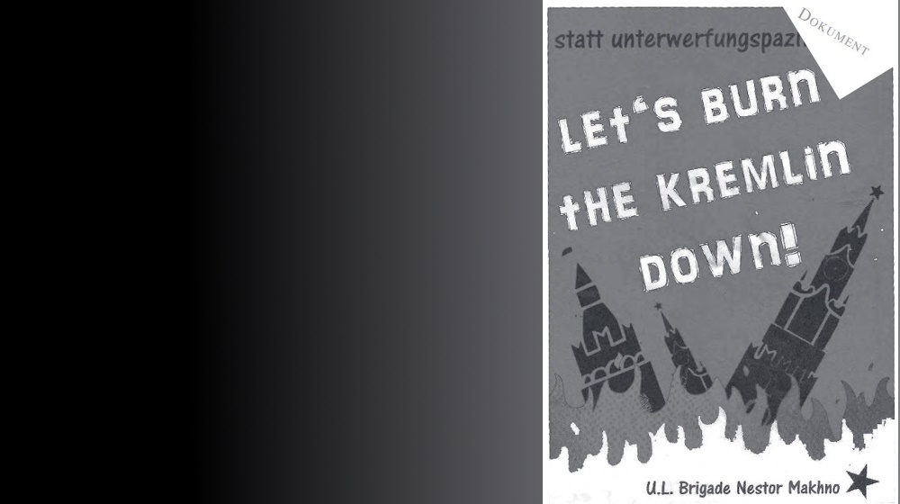 Mitte Mai 2023 fand ein Soli-Konzert für Connection e.V. in der Au, einem besetzten Kommunikationszentrum in Frankfurt/M., statt. Ich sollte eine kleine Rede dazu halten. Mich wunderten die merkwürdigen Plakate und Transparente, die dort überall hingen: „Gegen alle imperialistischen Kriege“ usw. Es waren auch Aufkleber zu finden: „statt unterwerfungspazifismus – Let’s burn the Kremlin down!“ von einer U.L. Brigade Nestor Machno (siehe Abbildung auf dieser Seite). Diese Brigade kämpft mit anarchistischer Flagge im Donbass und arbeitet mit dem Netzwerk Solidarity Collectives zusammen, das die Kämpfer mit Ausrüstung versorgt. (32) Ich erkundigte mich bei den Einladenden, was das alles zu bedeuten habe und bekam zur Antwort, dass sich am vergangenen Wochenende einige Dutzend Anarchisten, auch aus anderen Ländern, in der Au getroffen hätten, um sich auf die Reise in die Ukraine vorzubereiten. Laut ABC Kyiw vom 8. Mai 2024 „haben antiautoritäre Aktivist:innen beschlossen, sich dem militärischen Kampf anzuschließen, auch wenn dies bedeutet, mit dem ukrainischen Staat zu kooperieren“.